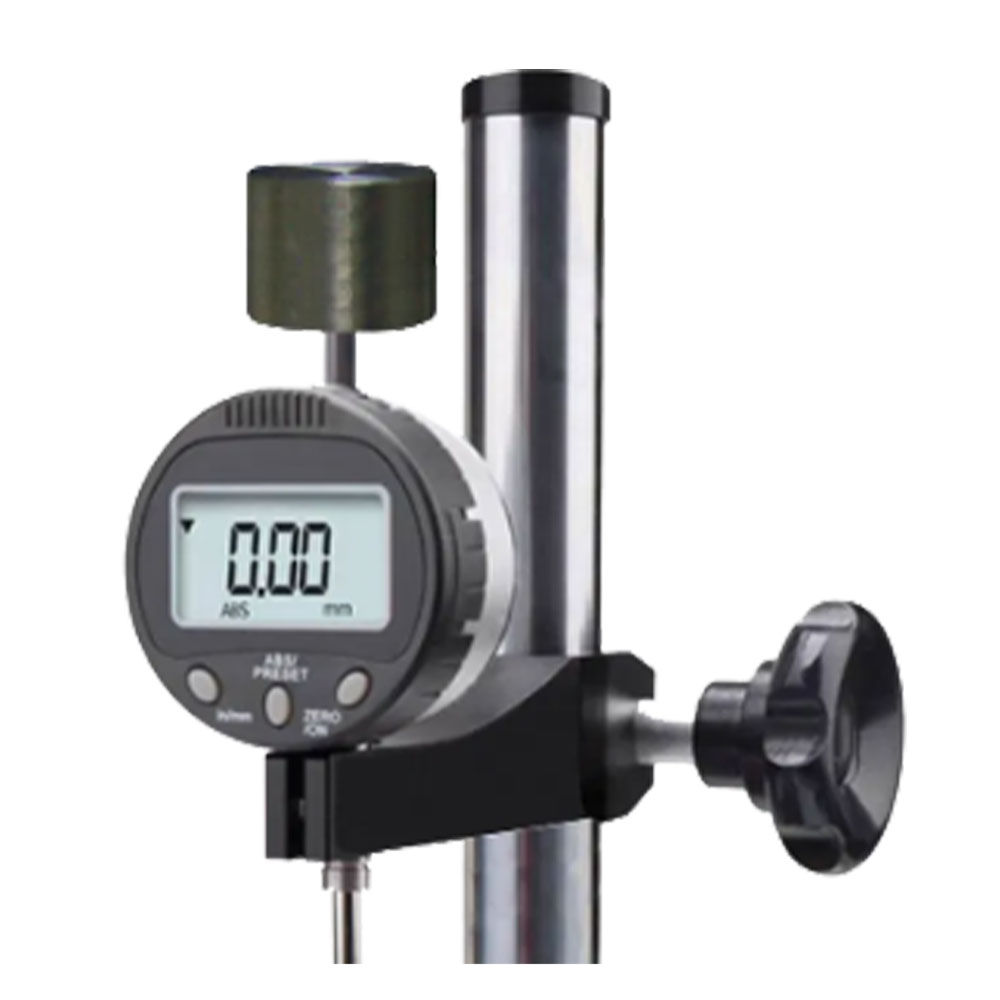 Fabrics Thickness Meter, affordable and accurate thickness gauge for soft materials with a gauging balance that applies minimal load to the specimen through a 1.129-inch (28.7mm) diameter presser foot. Thickness gauges have ranges up to 1/2 inch (13mm) or 1 inch (25mm) with a resolution of 0.001 inch (0.01mm). Comes with 1 load weight to provide 0.6psi (4.14KPA). Other configurations are also available on request