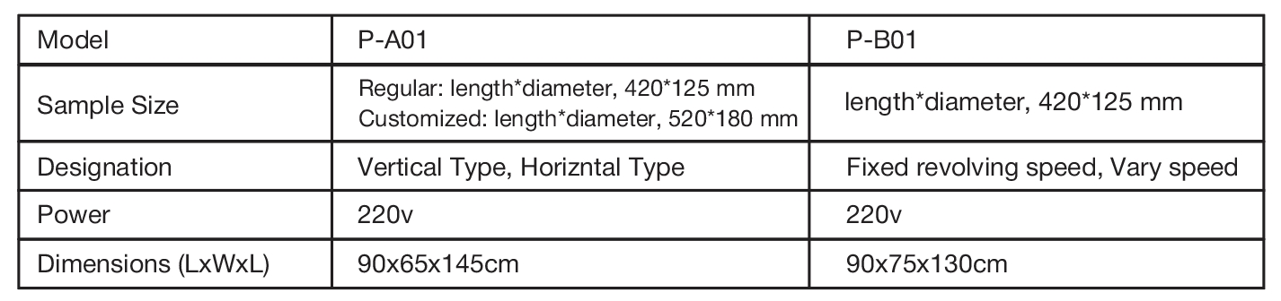 - Fixed revolving speed: 10 RPM (variable speed option available)